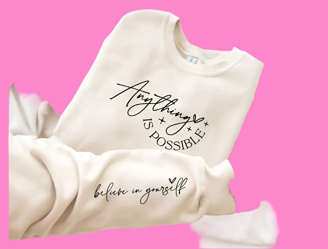 Enhance your wardrobe with our Anything is Possible collection. Featuring a bold and inspirational screen print, these t-shirts, crewnecks, and hoodies will remind you to always believe in yourself and your abilities. Made with high-quality materials, these items are the perfect combination of style and motivation. Order now and unleash your potential!