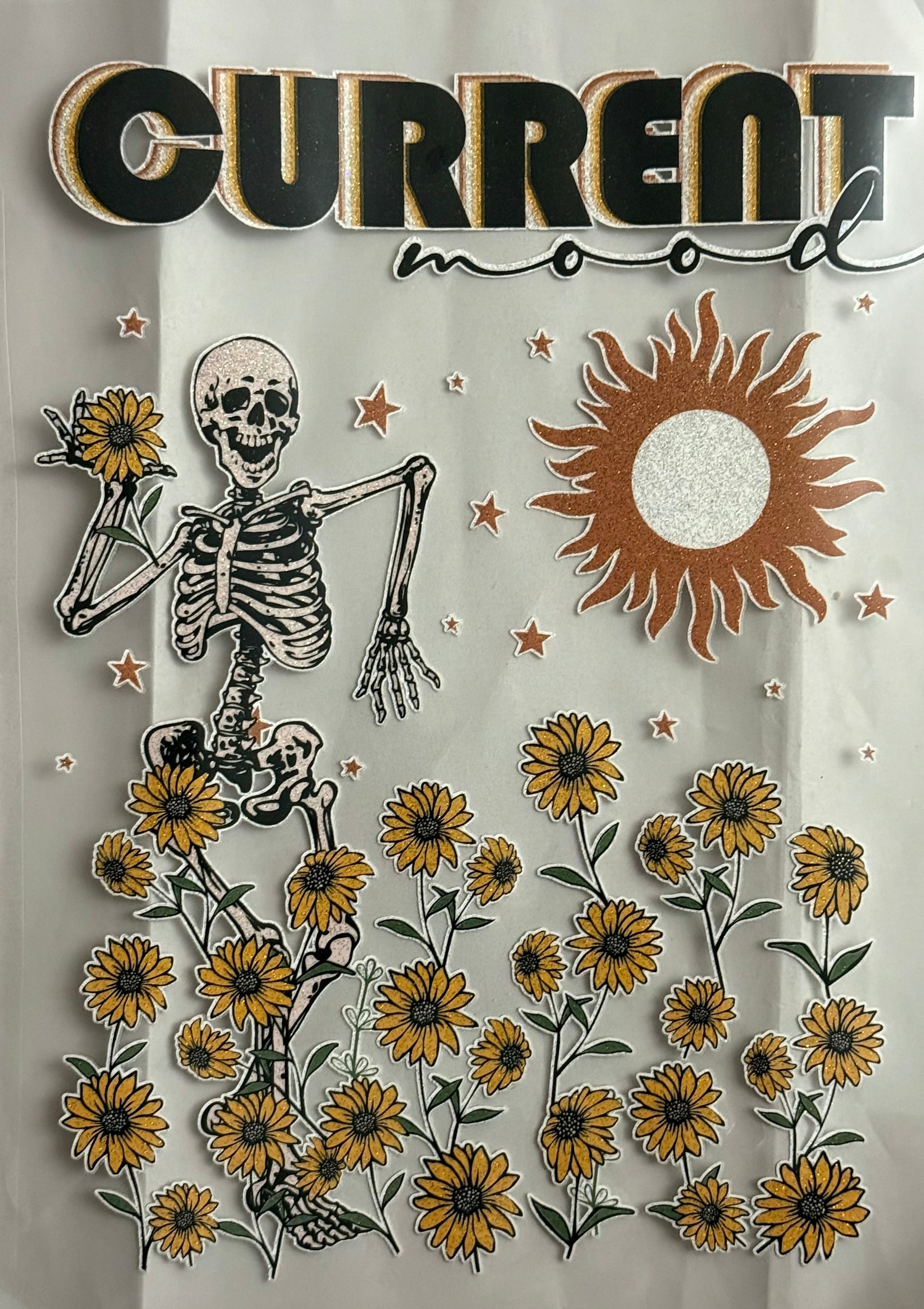 Enhance your wardrobe with our Current Mood Glitter Screen Print Transfer. This high quality transfer features glitter, sunflower and skeleton designs, perfect for adding some personality to your hoodies, t-shirts, and crewnecks. Express yourself with this unique and eye-catching transfer.