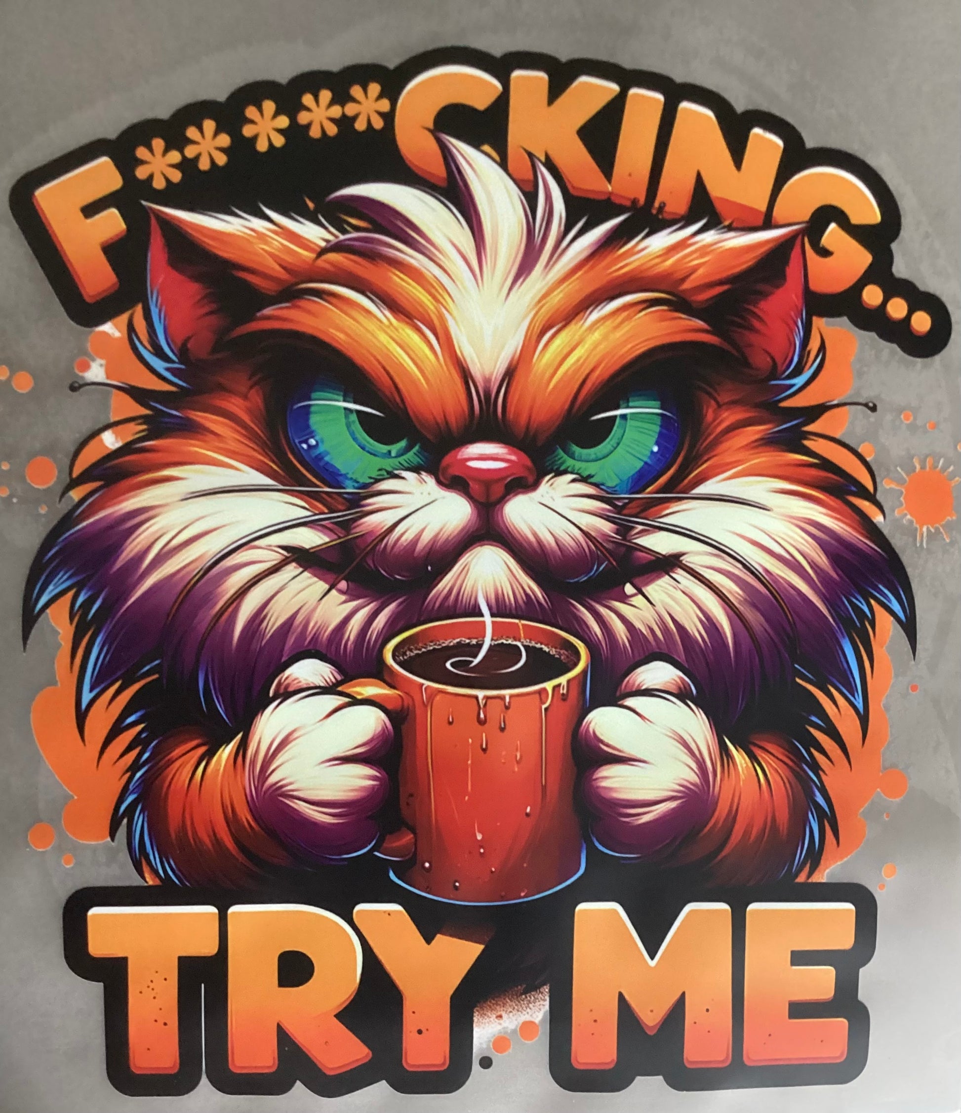 Our F*****CKING TRY ME! Transfer adds a touch of sarcastic humor to any t-shirt, crewneck, or hoodie. With its vivid and bright colors, this transfer is sure to make a statement. Don't be afraid to show off your bold personality with this eye-catching design.