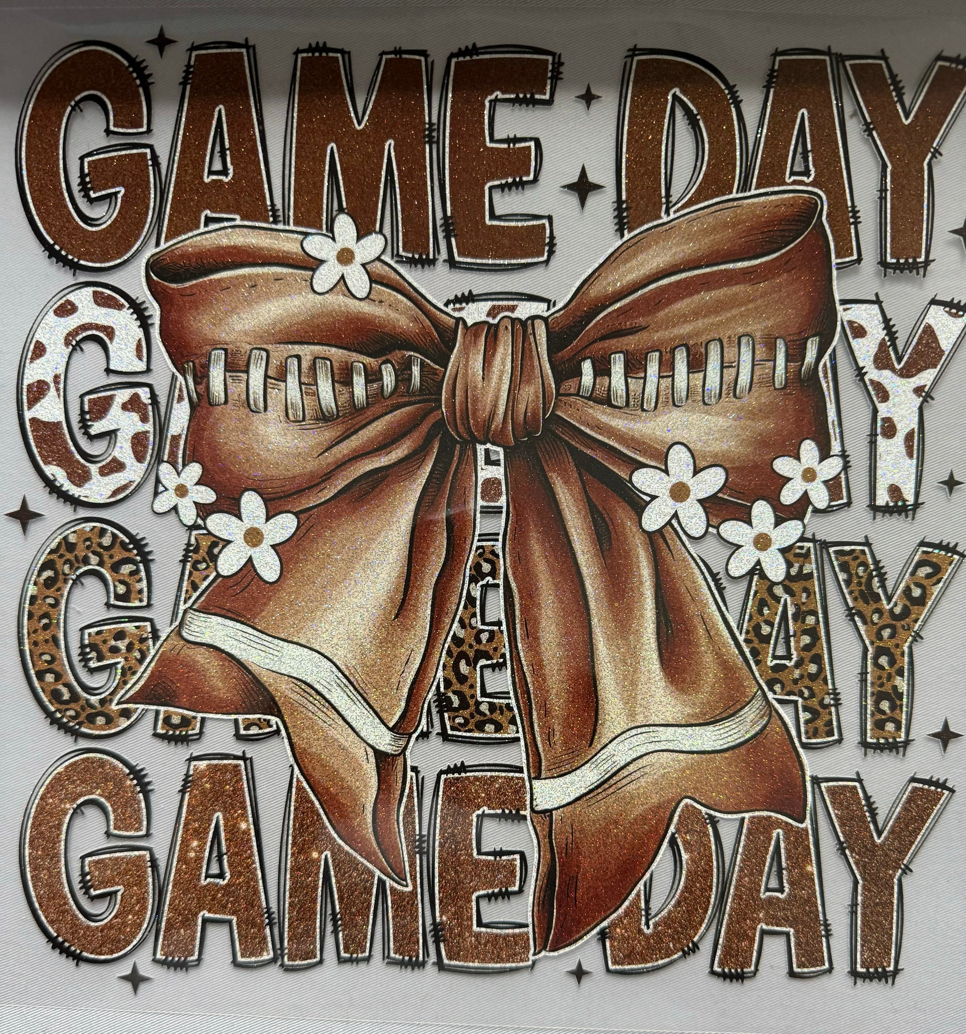 This Game Day Ribbon Transfer is perfect for any sports lover! Display your team spirit with the bold brown colors and banner design, while staying comfortable in the included sports tshirt and crewneck hoodie. Show off your team pride in style.