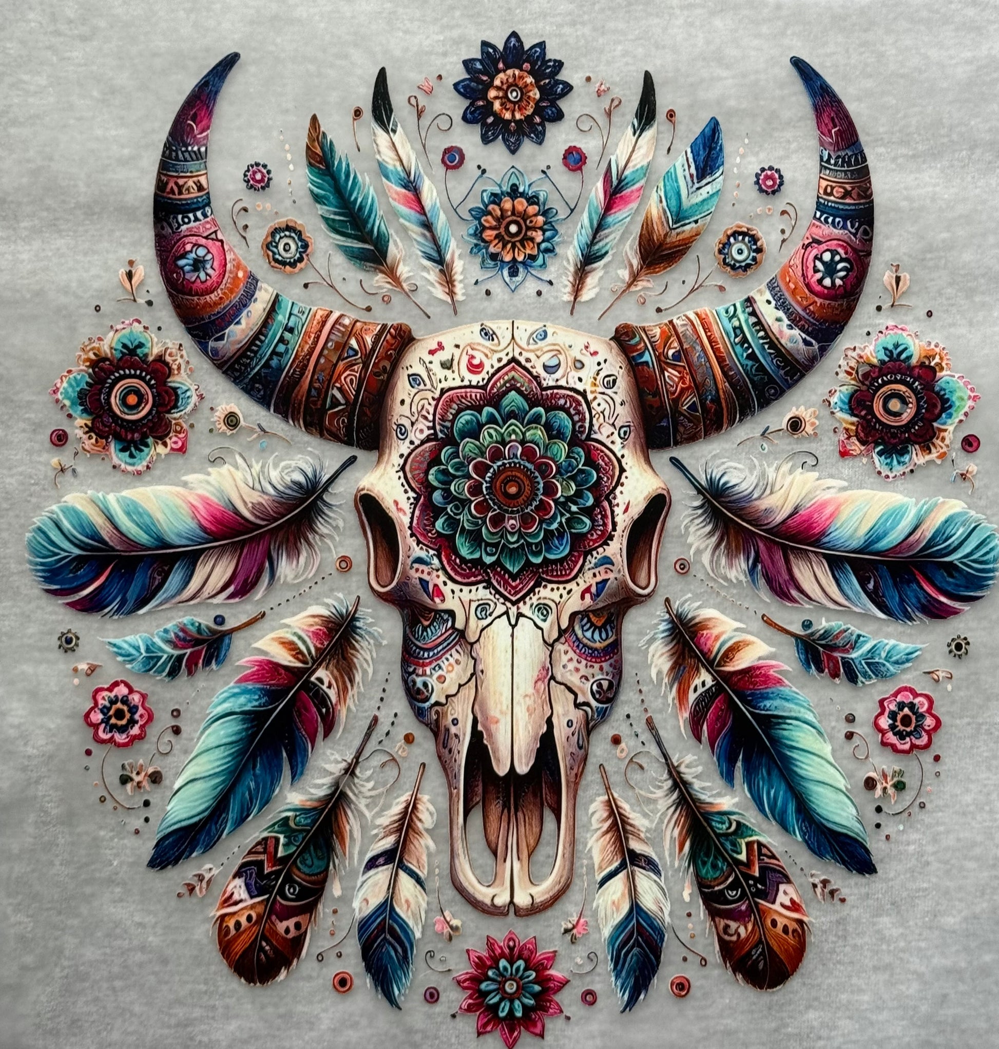 Add a touch of western style with our Longhorn Feathered Skull Clear Film Transfer. Featuring bold colors and real feathers, this design is perfect for hoodies, t-shirts, and crewnecks. Stand out from the crowd and show off your unique sense of fashion with this eye-catching transfer.
