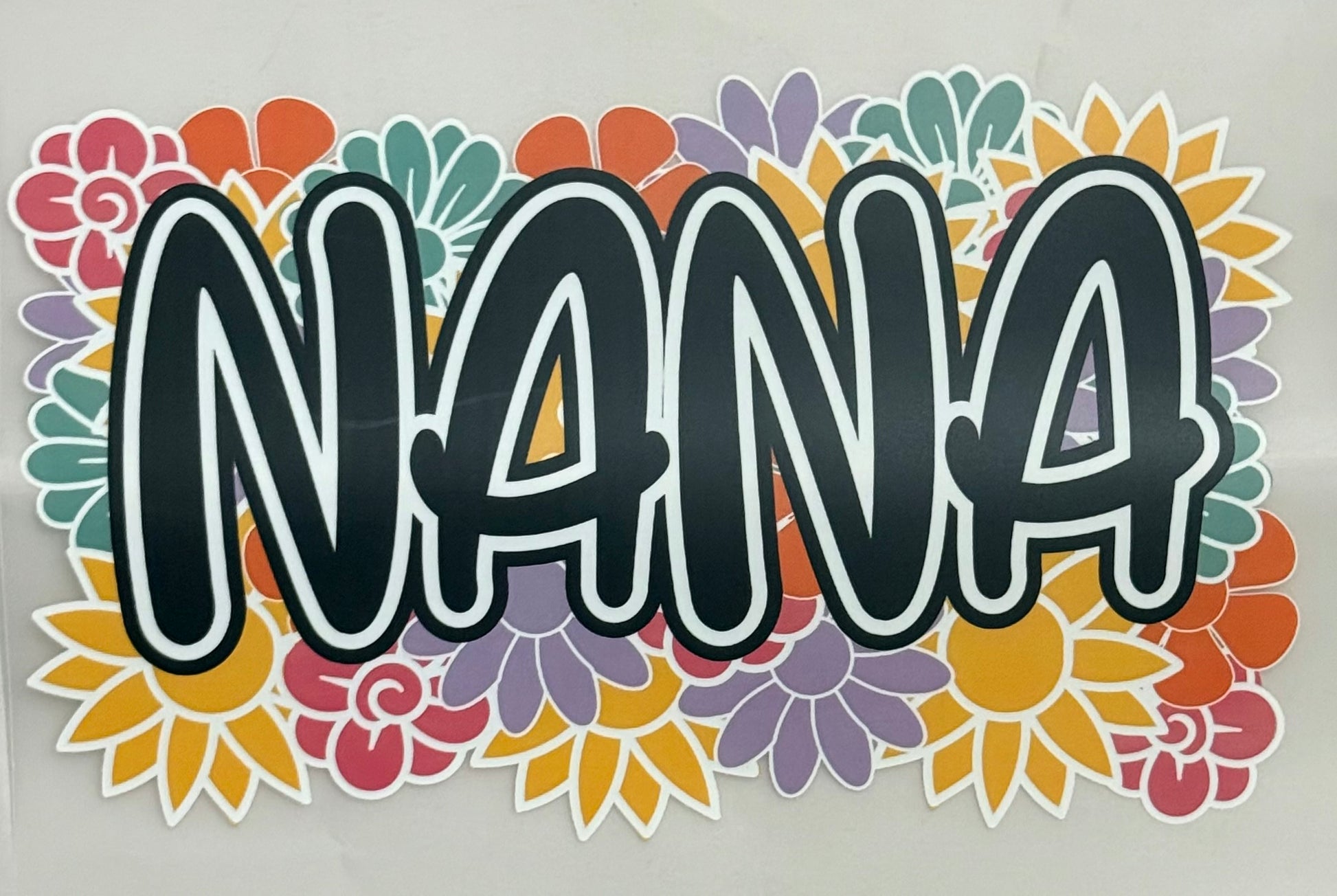 This multi-color screen print transfer features a beautiful flower design with the word "Nana," making it a loving addition to any grandma's t-shirts, crewnecks, or hoodies. Show your love in style!