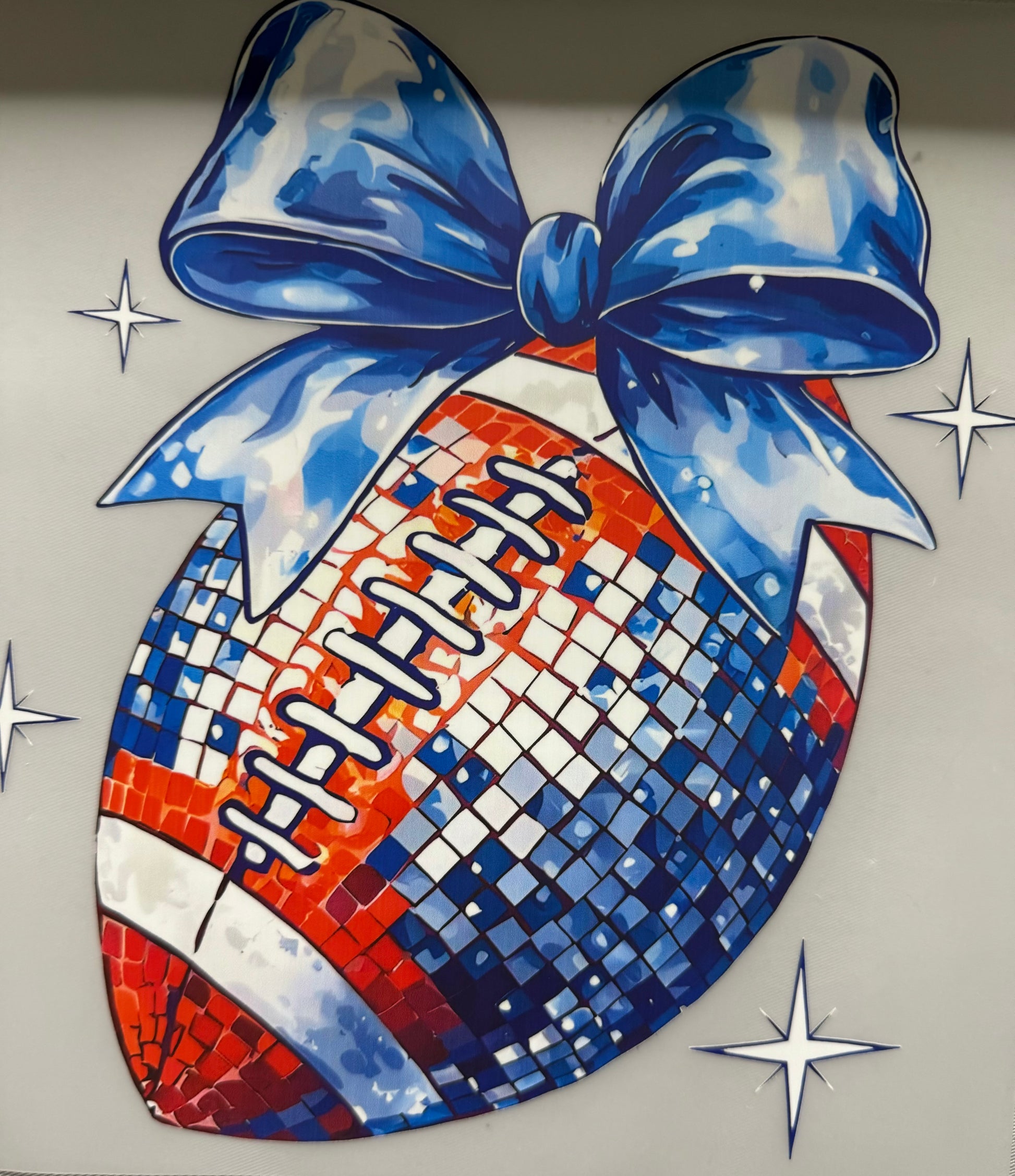 Experience the ultimate level of boldness with our Royal Blue Ribbon Football Transfer. Designed with vivid royal blue and orange colors, this football is perfect for making a statement on the field. The sparkly blue ribbon adds an extra touch of style. Get ready to shine in any game with your t-shirts, crewnecks, and hoodies.