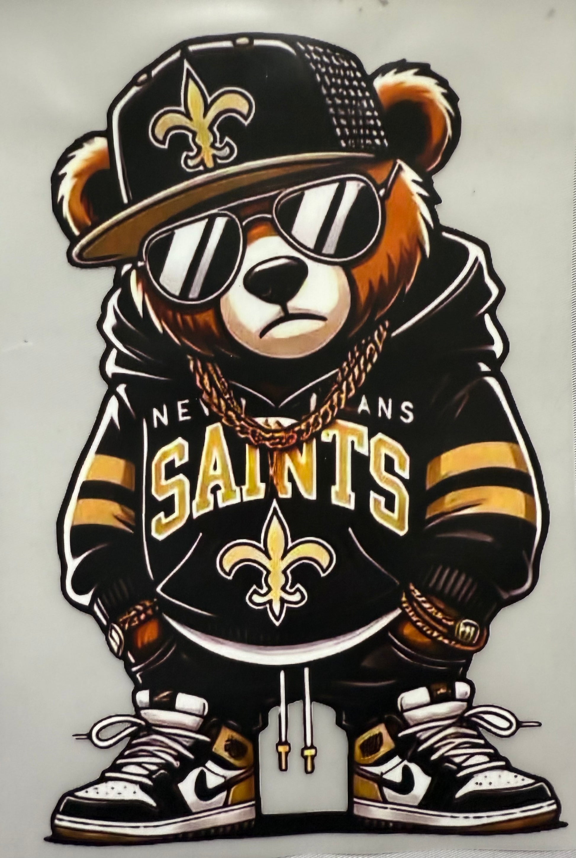 Get ready for game day with our Saints Teddy Bear Football Transfer! This cute and colorful teddy bear comes with a gold chain featuring the Saints emblem, making it the perfect accessory for any fan. It's also available on t-shirts, crewnecks, and hoodies, so you can show off your team spirit in style. A must-have for any Saints fan!