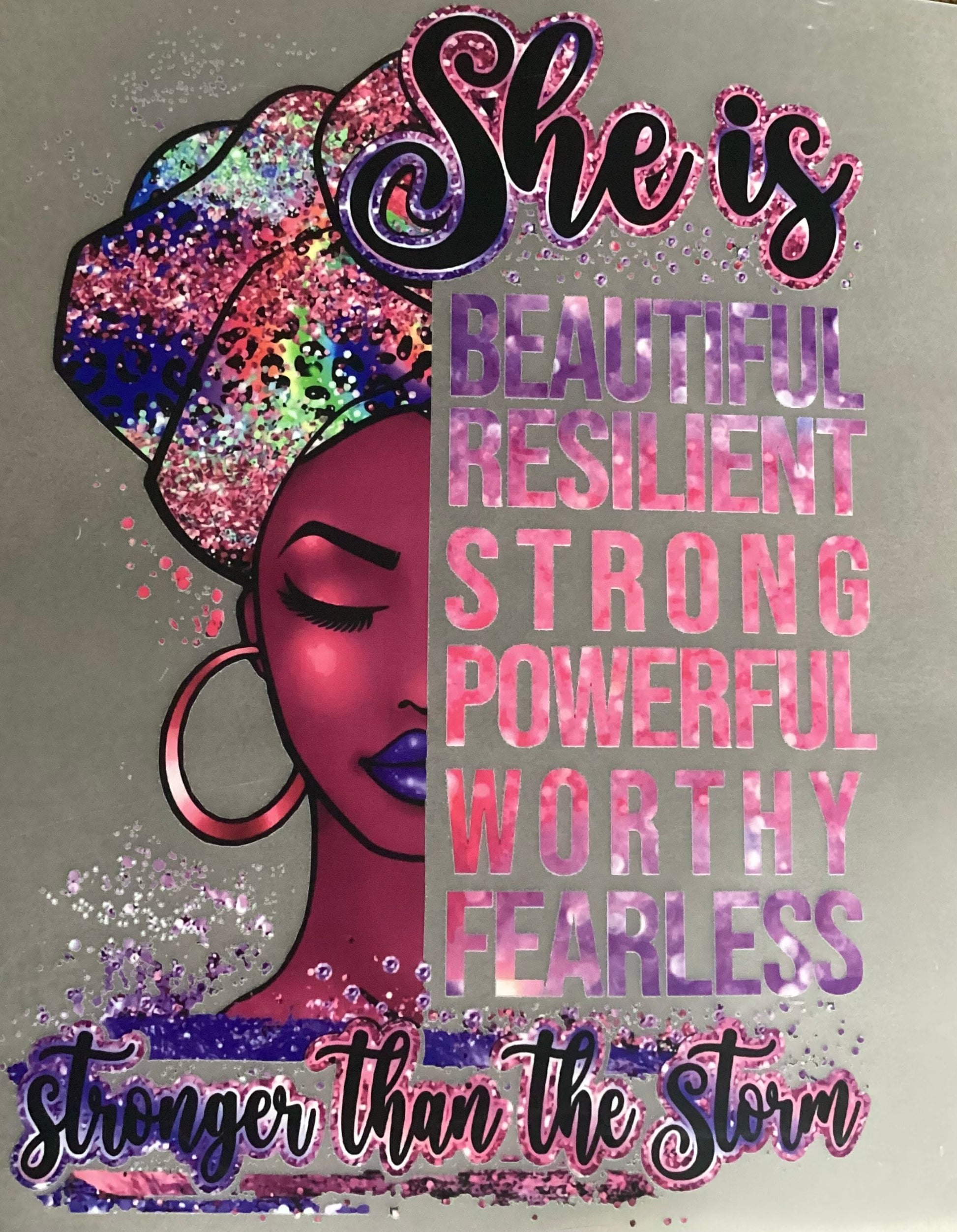 Introducing the SHE IS Stronger Than The Storm Transfer – a bright and bold transfer that features a powerful woman silhouette with descriptive words of affirmation. Perfect for creating meaningful and motivational clothing items, such as t-shirts, crewnecks, and hoodies. Let this transfer serve as a reminder of strength and resilience.