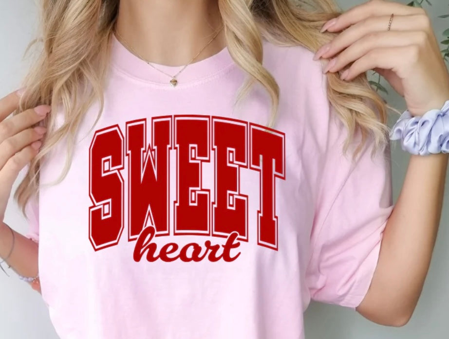 Introducing SWEET HEART - the perfect addition to your wardrobe! Featuring a bold red transfer that announces your sweet heart status, this fun print is perfect for t-shirts, hoodies, and crewnecks. Don't miss out on this must-have design.